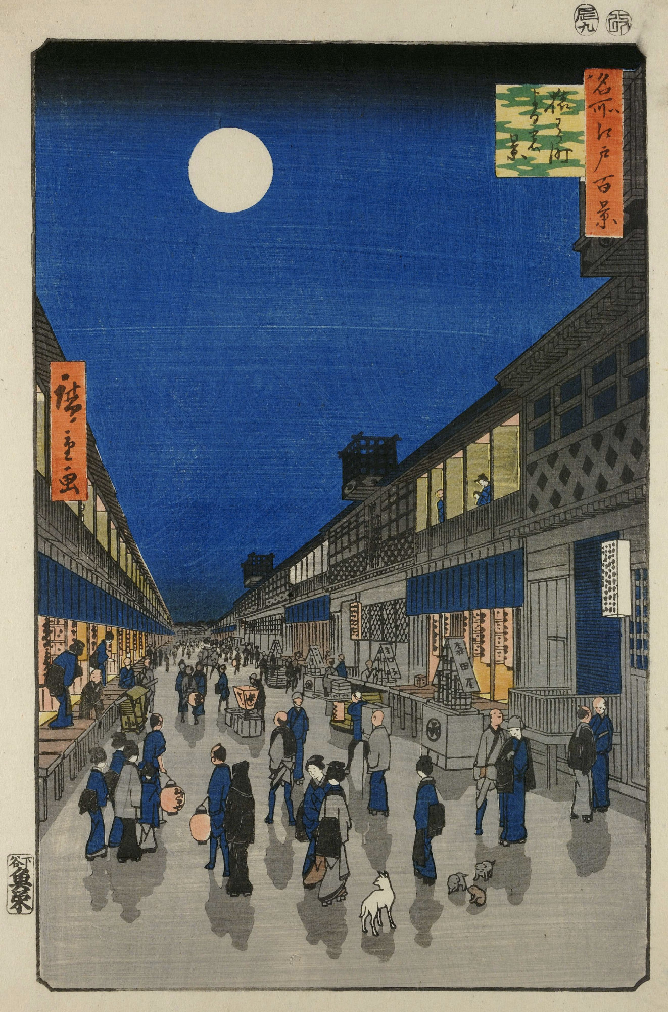 | 90 | Night View of Saruwaka-machi Saruwaka-machi yoru no kei 猿わか町よるの景 | Wisp of cloud across moon was unique to each print. | 9/1856 |
